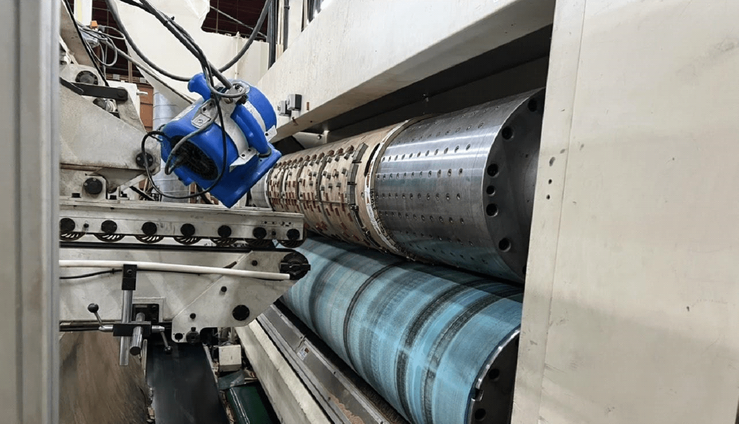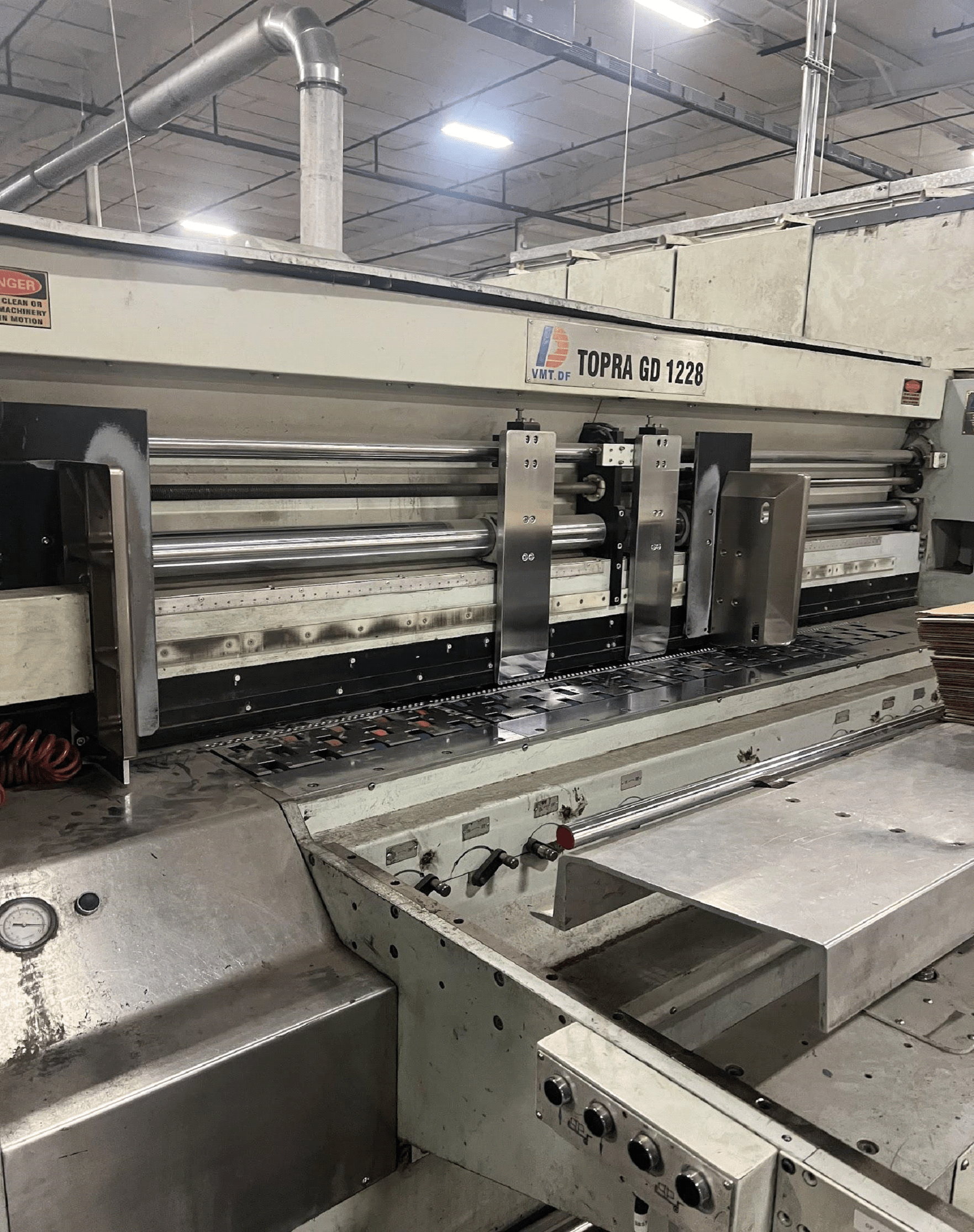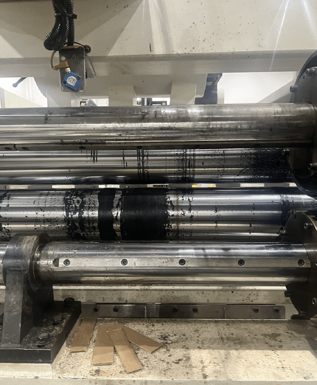 ⦁ Blow out area: pay special attention between the gang rollers and all of the belts. The area after the die cutter and where all the excess scrap travels on the rails tracks need to be blown out and cleaned as well.