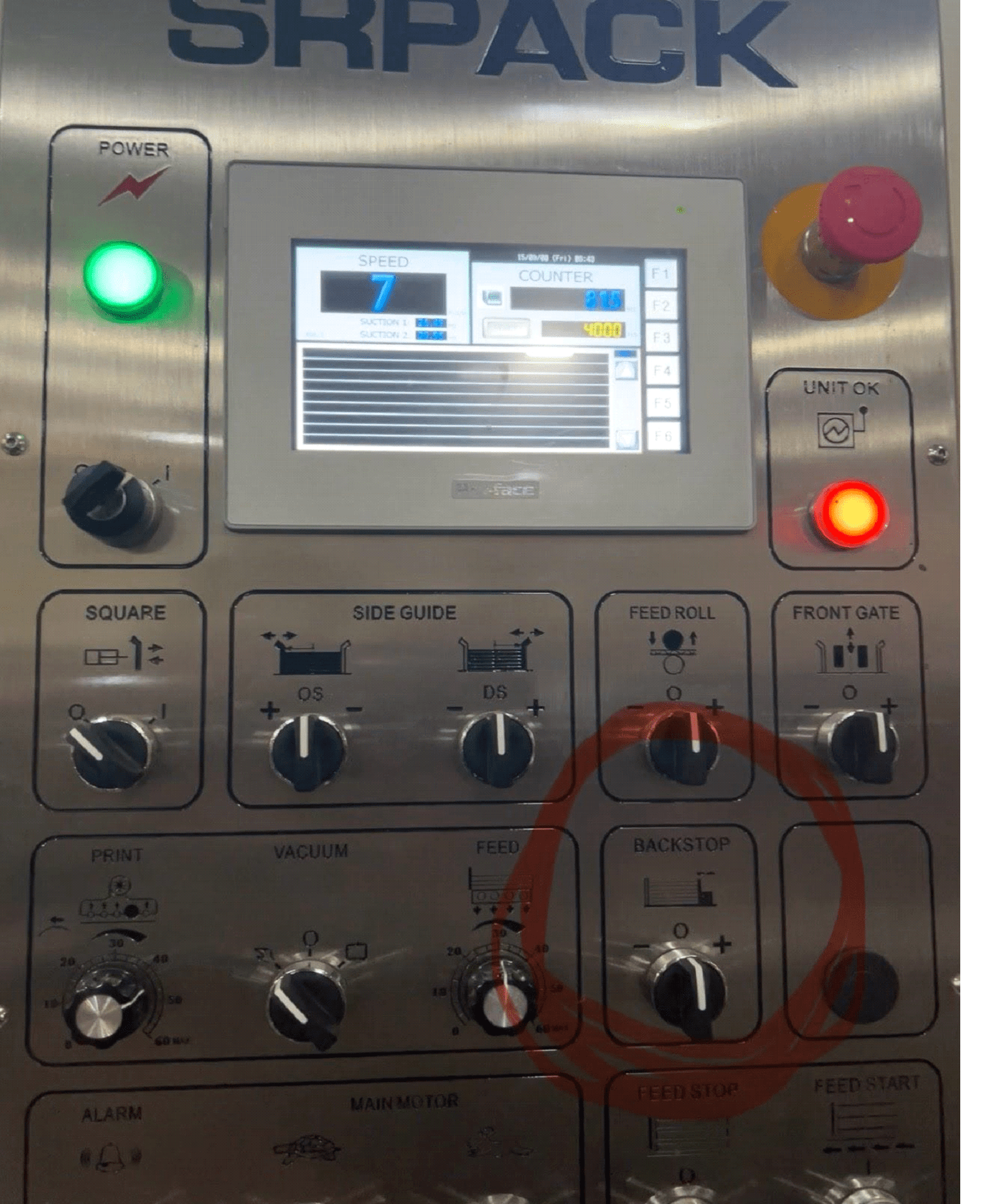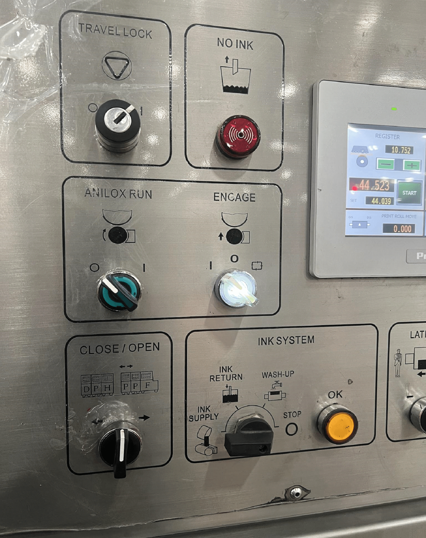 The Operator Side Panel on the feed section is some of the most important buttons and switches. Each unit will have a CLOSE/OPEN Switch along with a light blue machine unlock button.