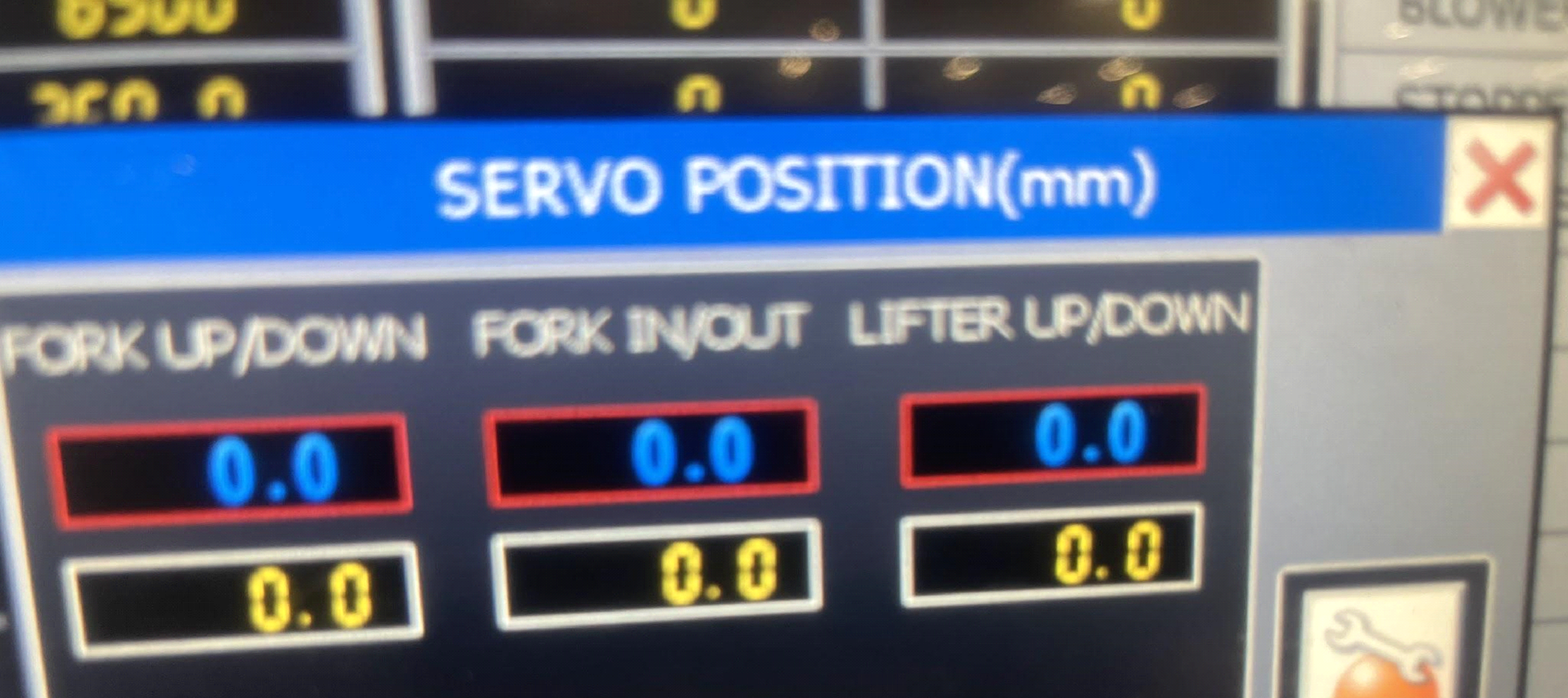 ⦁ Hit the Wrench on a hard hat icon. Hit this button. This will now ask if you want to reset these locations with a push of the button to zero. Only hit okay on the lifter up and down. This will zero that location which is the lifter up and down.