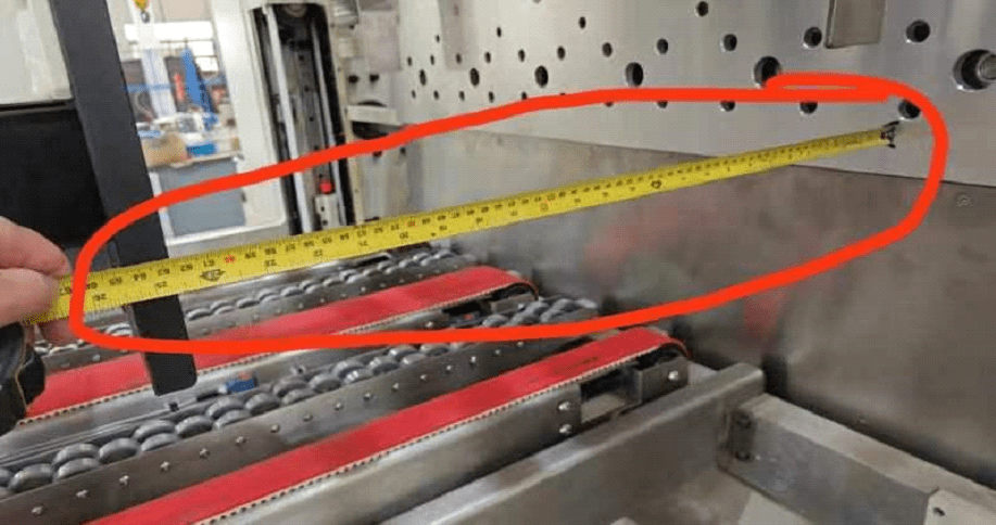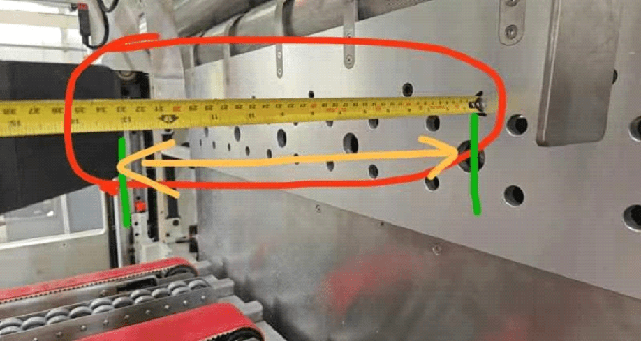 Next is measuring the distance from the pusher plate to the edge of the paper forks. This dimension is your forks in and out. If the backstop is set correctly and this number is entered correctly on the HMI SCREEN then you should not have any issues with FORK IN and OUT ERRORS.