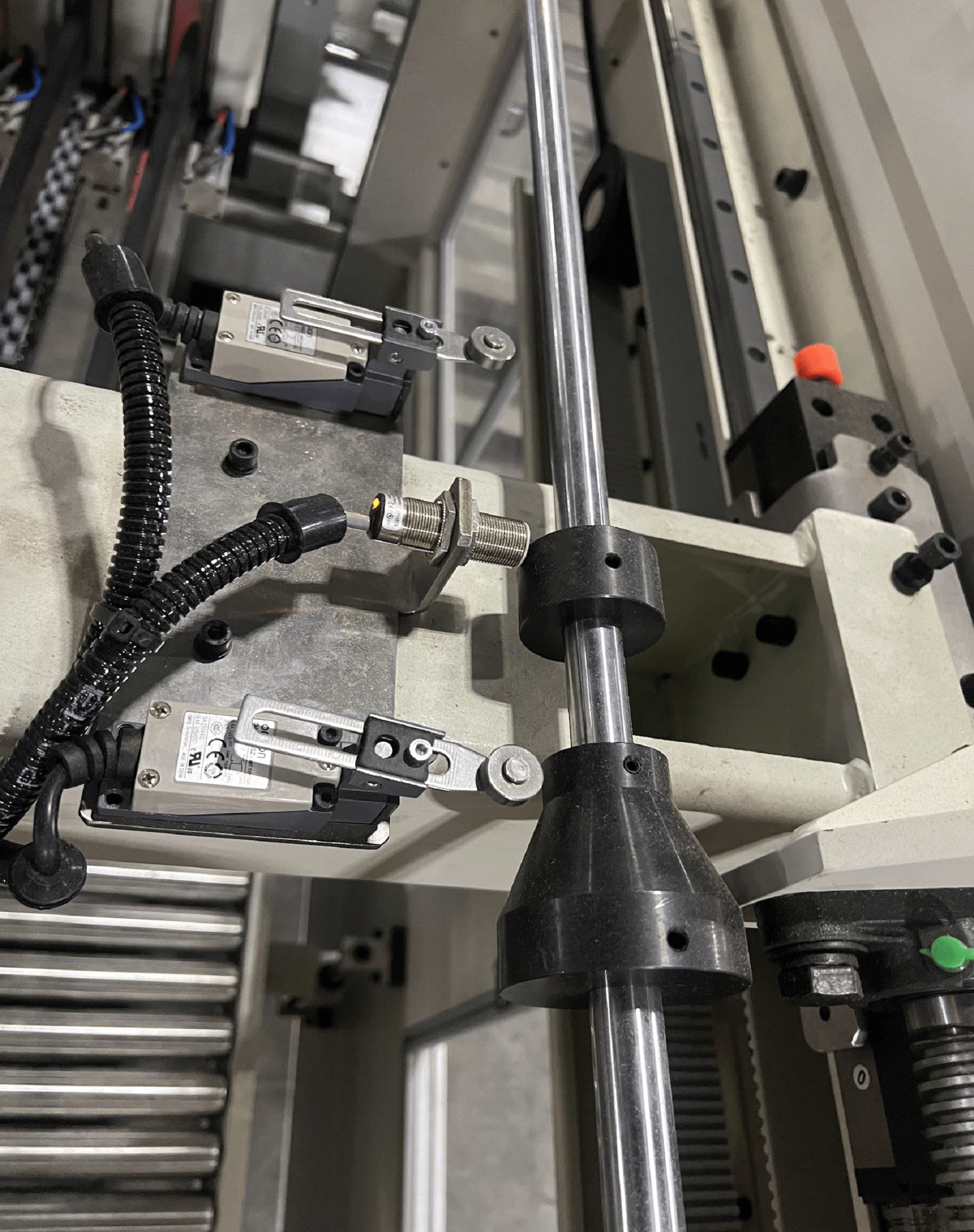 The pictures above and below are the Proximity switches that need to be aligned when homing to zero. Make sure that all of these connections are tight and secure on a regular basis. Note the limit switch located right below as well.
