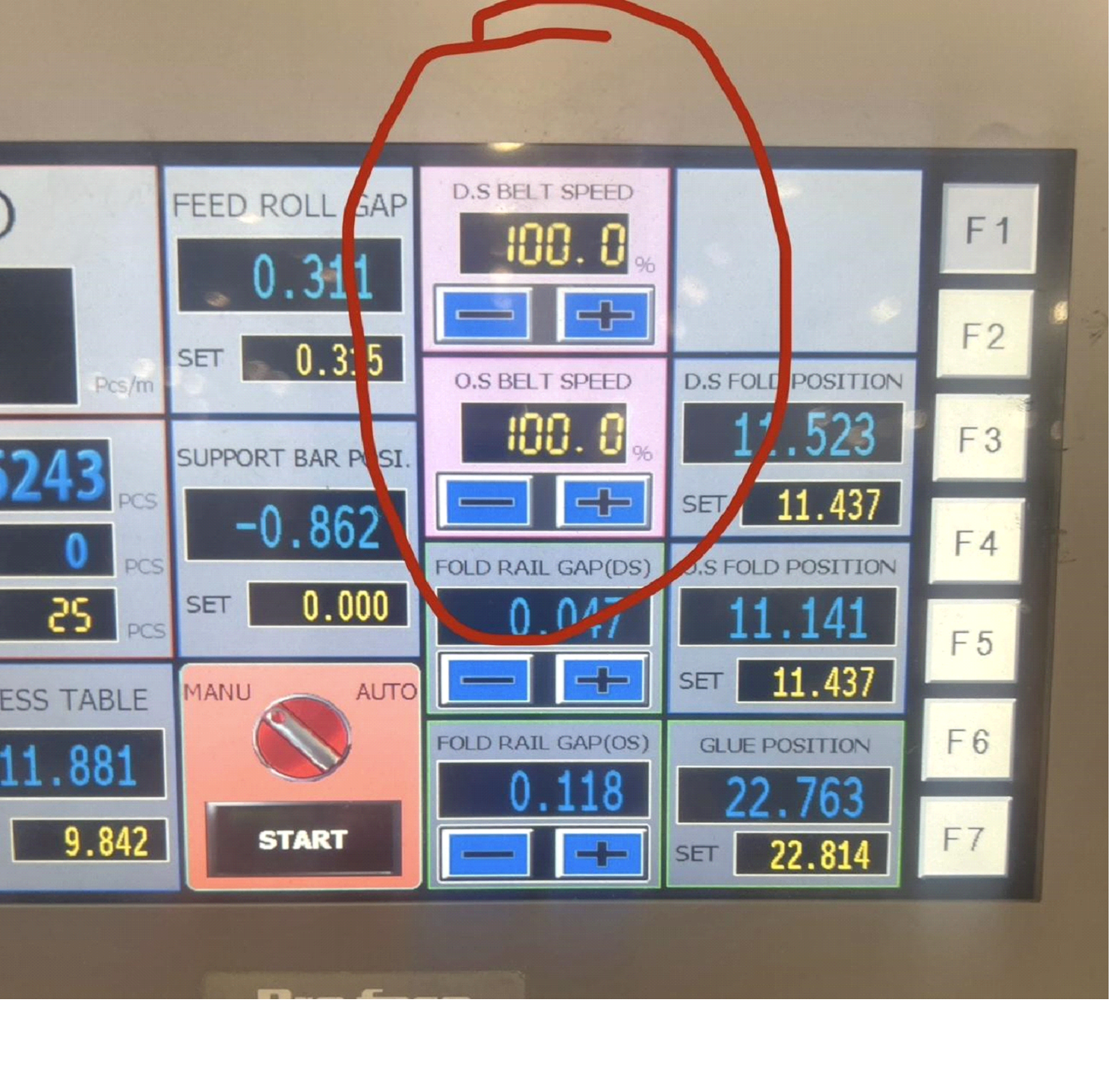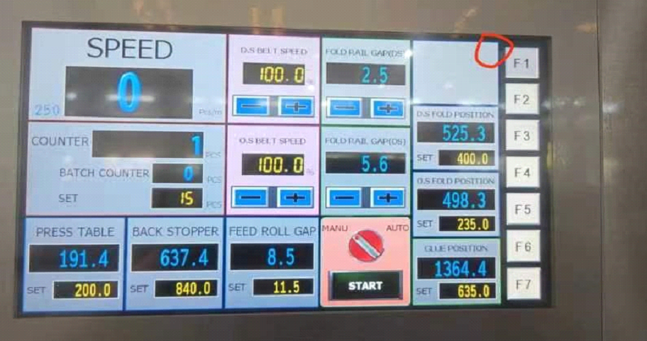 ⦁ Folding Belts Speeds in the Rails- This is located in the counter ejector LCD screen. This allows you to speed up and slow down the folding belts on the inside of your rails. If you change these speeds, they DO NOT CHANGE BACK TO 100 and 100. You need to start each order at 100 and 100 on the folding belt speed.