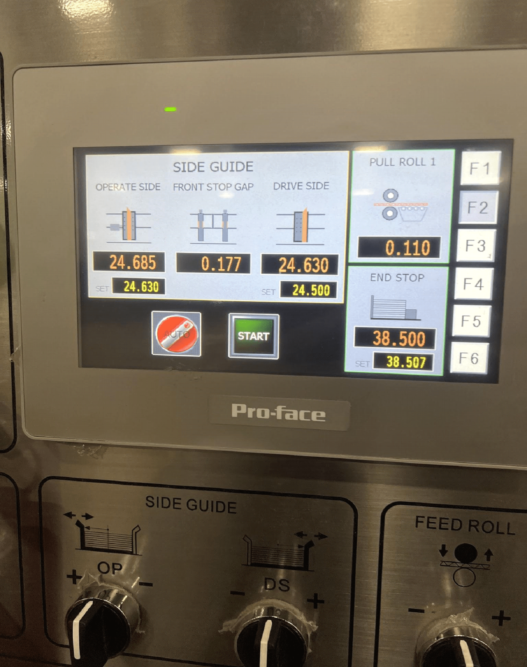 From this picture you can also see the orange and yellow numbers. The orange being the “ACTUAL” measurement the part is at and the yellow being the number the machine was to “SET UP” at. The Backstop (ENDSTOP) is in the lower right corner.