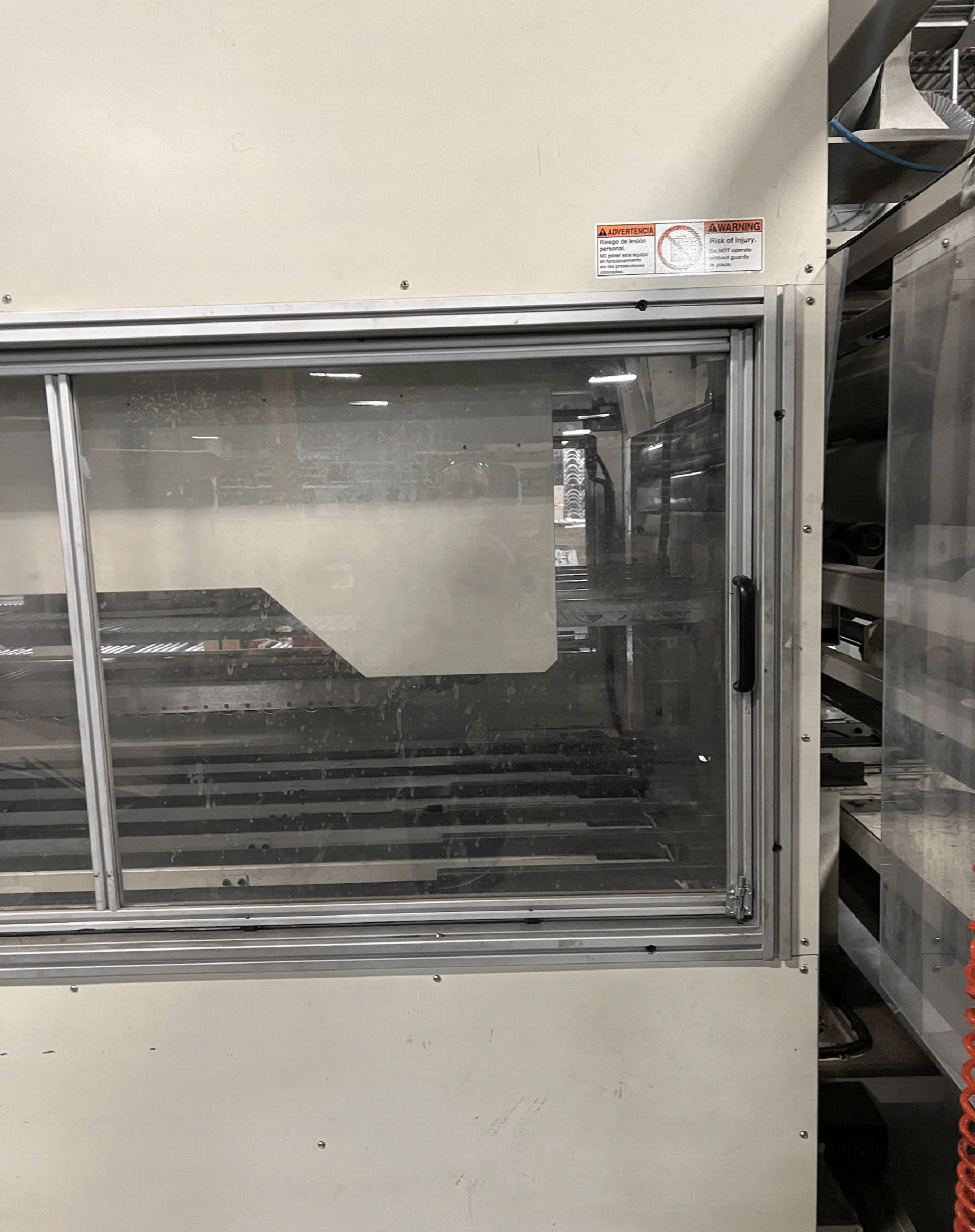 The SRPACK alarms and faults can be seen on the front LCD screen as well as the CNC for the machine. The machine is full of safety features with e-stops, pull cords, door and gate sensors, and other items to keep the employees safe. Please do not change or remove these items.