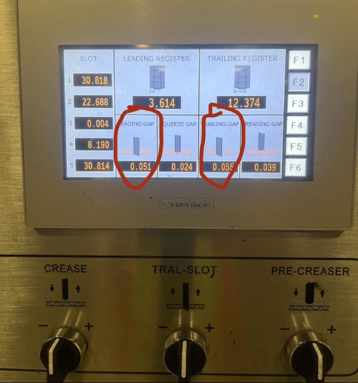 ⦁ Lead and Trail Knives in the Slotter Section – These raise up every order to allow the knives to go into slot and move side to side. They must be set every order. You should know what this number is as it varies by machine. If you do not then view SOP on setting up your lead and trail knives. These numbers need to be set every order.
